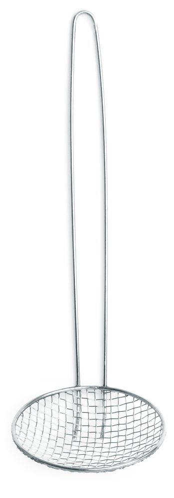 Chochla ze stali nierdzewnej do porcjowania smażonych frytek z pojemnika grzewczego. Średnica określa wielkość porcji; wybierz rozmiar odpowiednio. Druciana rączka. Bezpieczna w zmywarce.