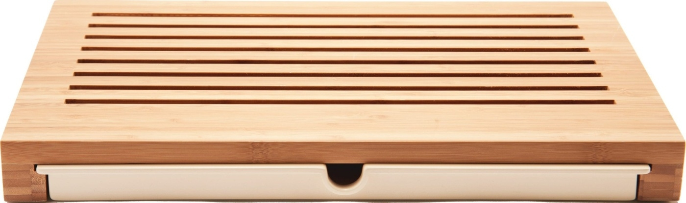"Bambusowa deska do krojenia chleba z plastikowym pojemnikiem na okruchy. Wymiary: 42 x 27 x (wys.) 4,5 cm Projekt: Anna & Gian Franco Gasparini"