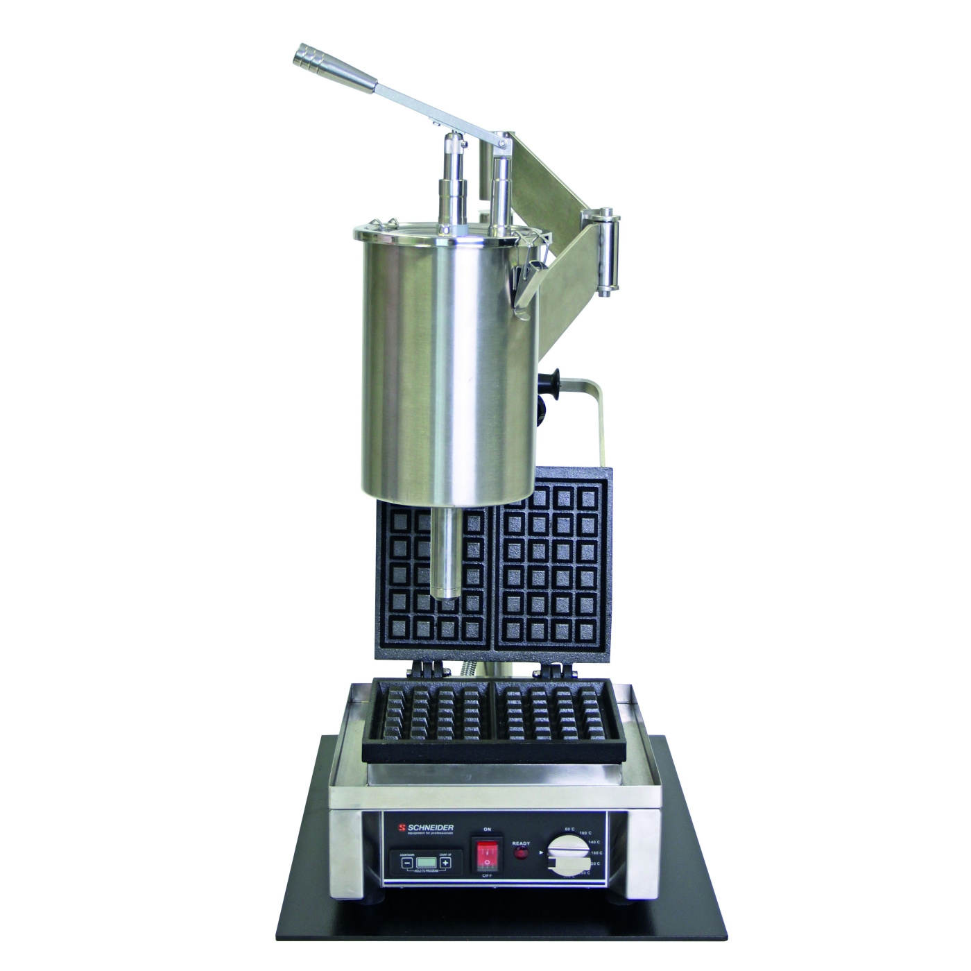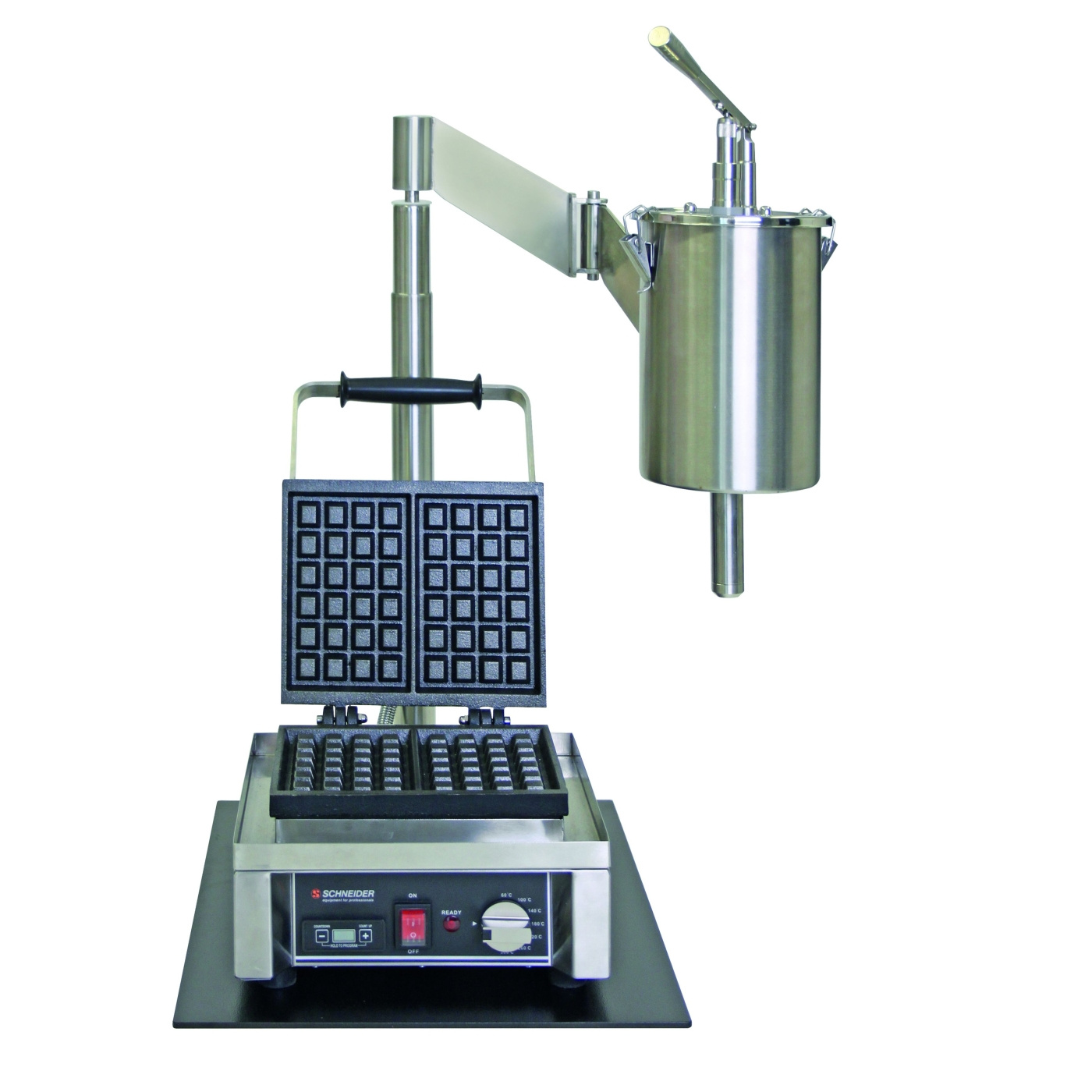 Dysza wylotowa jest obrotowa i może być ustawiona dokładnie nad powierzchnią urządzenia bez konieczności przesuwania stojaka. Dozowanie odbywa się przez dźwignię i daje ±50 ml na naciśnięcie, zapewniając spójną wielkość porcji dla każdego gofra podczas całego serwisu. Stojak zajmuje powierzchnię 450x450 mm i ma 1.000 mm wysokości.