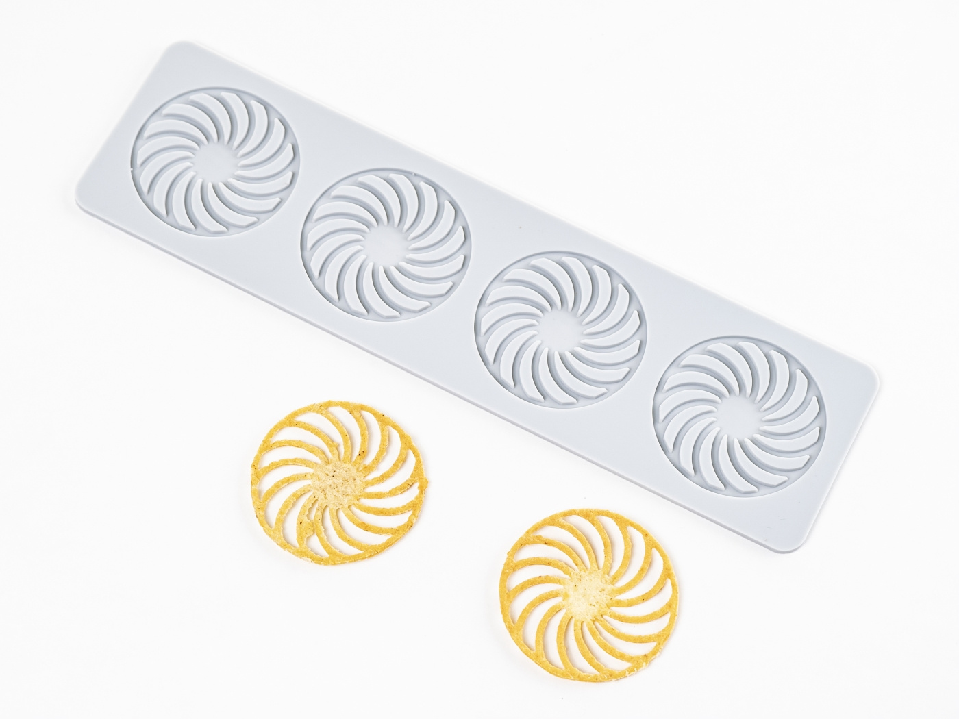 Zgrabna silikonowa forma do odlewania tuille i dekorów z wielką elegancją. Wytrzymuje temperatury od -40°C do +230°C, co oznacza, że nadaje się do chłodziarki szokowej, zamrażarki, piekarnika, ale także do mikrofalówki, zmywarki i przechowywania w szufladzie.