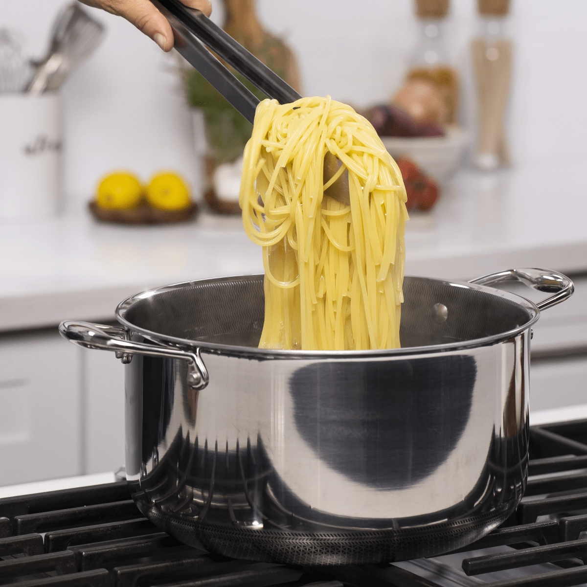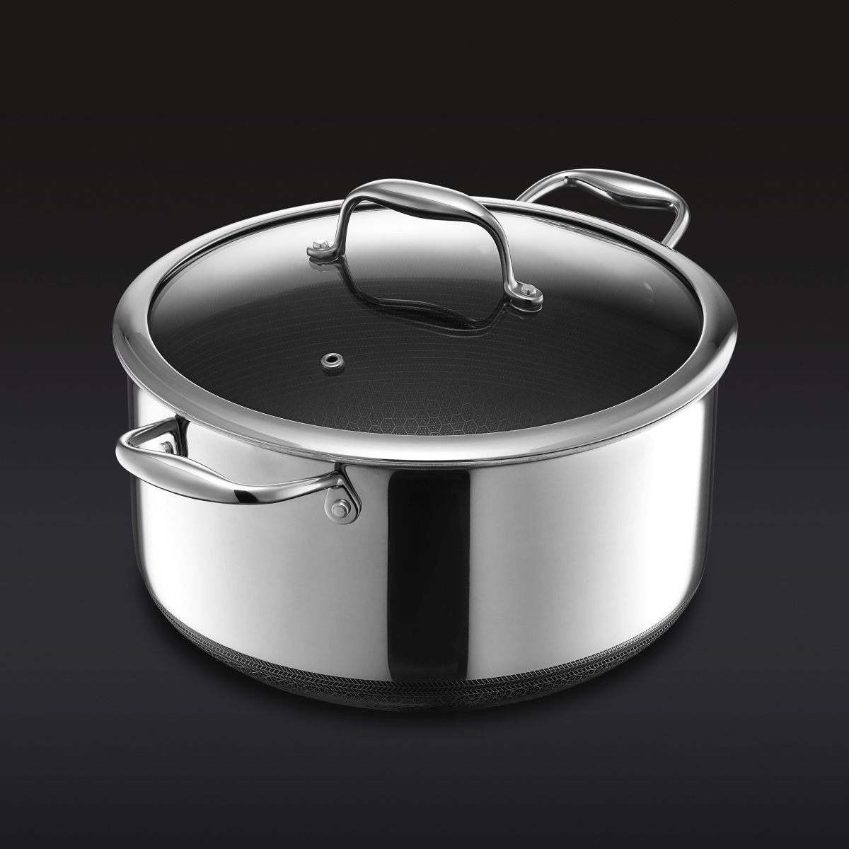 Hybrydowa brytfanna Hexclad z pokrywą 7,6 l to duży garnek do poważnych zadań kuchennych - idealny do gotowania gulaszu, zup, wolno gotowanych posiłków, dużych dań mięsnych lub dużych porcji dla rodziny i przyjaciół. Dzięki dużej pojemności daje swobodę w zakresie smaku, ciepła i objętości.