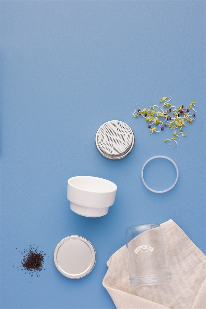 Kopuła, która pomaga wyhodować własne kiełki i mikrozielone warzywa na fantazyjne talerze. Składa się z ceramicznej podstawy, silikonowej i metalowej siatki oraz szklanego słoika. Prosty, ale atrakcyjny design do wyeksponowania w kuchni. Ø 11,5 cm, wysokość 21 cm. Pojemność 500 ml.
