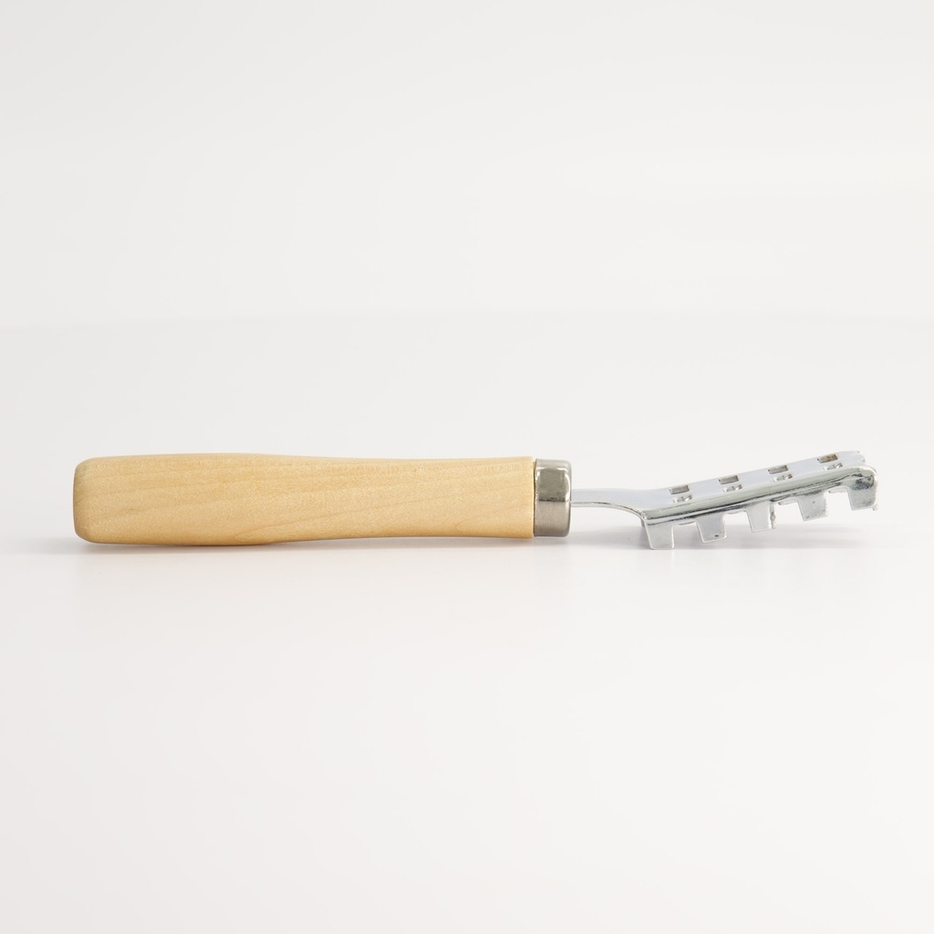 Odławianie ryb rzadko jest najprzyjemniejszą częścią kuchni, ale odpowiednie narzędzie robi różnicę. Skaler do ryb jest prosty, ciężki jak na swój rozmiar i zbudowany tak, aby szybko usuwać łuski bez uszkadzania skóry. Podniesione krawędzie głowicy chwytają łuski i zapobiegają ich odbijaniu się, dzięki czemu praca jest znacznie mniej niechlujna.