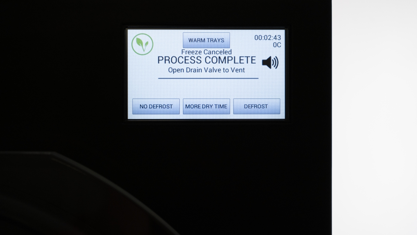 Aby wyczyścić, ustaw tryb rozmrażania i otwórz zawór. Warstwa lodu, która utworzyła się wokół komory, całkowicie się rozmrozi, a po dokładnym wyczyszczeniu można rozpocząć nowy proces liofilizacji.