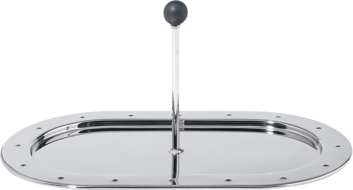 Mała taca z błyszczącej stali 18/10 z czarną plastikową gałką. Wymiary: 28,5 x 16,5 cm Wysokość: 12,5 cm Projekt: Michael Graves