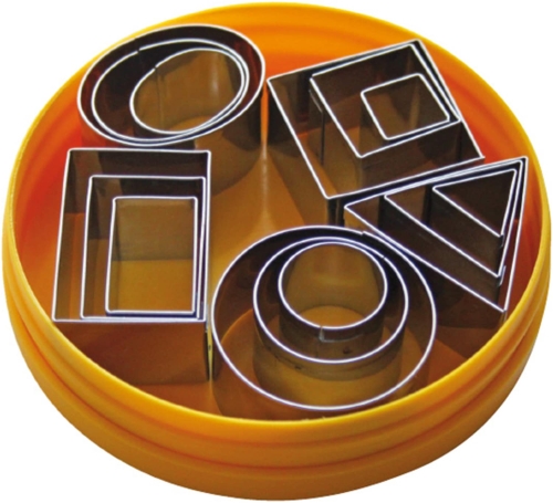 Zestaw wykrawaczy z 15 geometrycznymi formami ze stali nierdzewnej, wysokość 20 mm, grubość materiału 0,3 mm. W cukierni formy używane są do wykrawania fondantu, marcepanu i ciasta cukrowego w precyzyjne geometryczne detale. W fine dining są równie na miejscu: terrina w temperaturze pokojowej, stężały sprasowany liść warzywny, plaster galarety lub cienkie carpaccio kroją się w dokładne geometrie bezpośrednio na talerzu bez potrzeby cięcia z wolnej ręki. Ostra krawędź ze stali 0,3 mm daje czyste cięcie bez ściskania delikatnych preparatów. Odporne na zmywarkę i układające się w stosy.