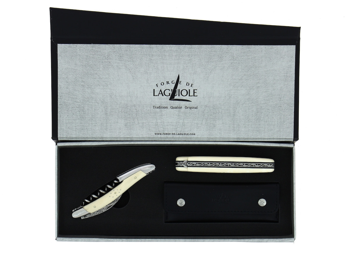 Nóż składany i nóż sommelierski z rogu mamuta, damascenizowany - Forge de Laguiole