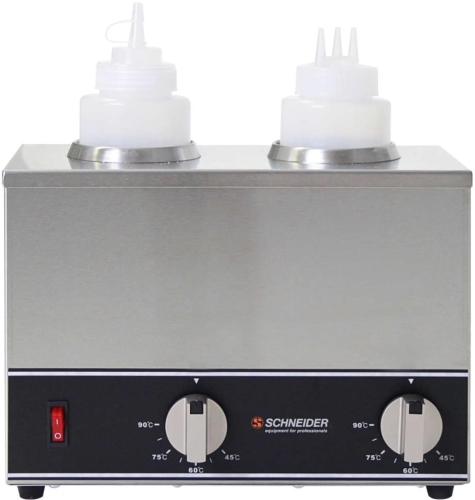 Podgrzewacz do butelek dla kuchni podających ciepłe sosy, emulsje lub oleje bezpośrednio z butelki do dresingu podczas serwisu. Elektryczny model Schneidera podgrzewa bez łaźni wodnej: butelka siedzi w zamkniętym przedziale, który utrzymuje temperaturę poprzez bezpośredni kontakt i ciepłe powietrze, co oznacza brak wody do wymiany, brak rdzy i minimalne utrzymanie między zmianami. Temperatura jest bezstopniowo regulowana między 40 a 90°C, obejmując wszystko od beurre blanc w temperaturze serwowania po gorącą garniturę chili bez ryzyka przegrzania delikatnych emulsji.