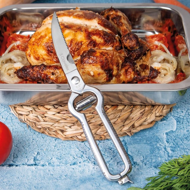 To nożyce do drobiu przeznaczone do kuchni, w których praca z całym ptakiem nie jest romantyczną wizją, lecz codziennością. Model 3 Claveles Professional jest kuty na gorąco, co oznacza, że stal formowana jest w wysokiej temperaturze z litego bloku, a nie wycinana z arkusza blachy. Efekt czuć od razu w dłoni. Konstrukcja jest odporna na skręcanie, przegub stabilny, a reakcja natychmiastowa. Gdy przecinasz mostek, oddzielasz udka lub otwierasz ptaka do przygotowania w stylu spatchcock, ruch jest pewny i zdecydowany, bez miękkości i wahania. Cięcie jest czyste i kontrolowane.