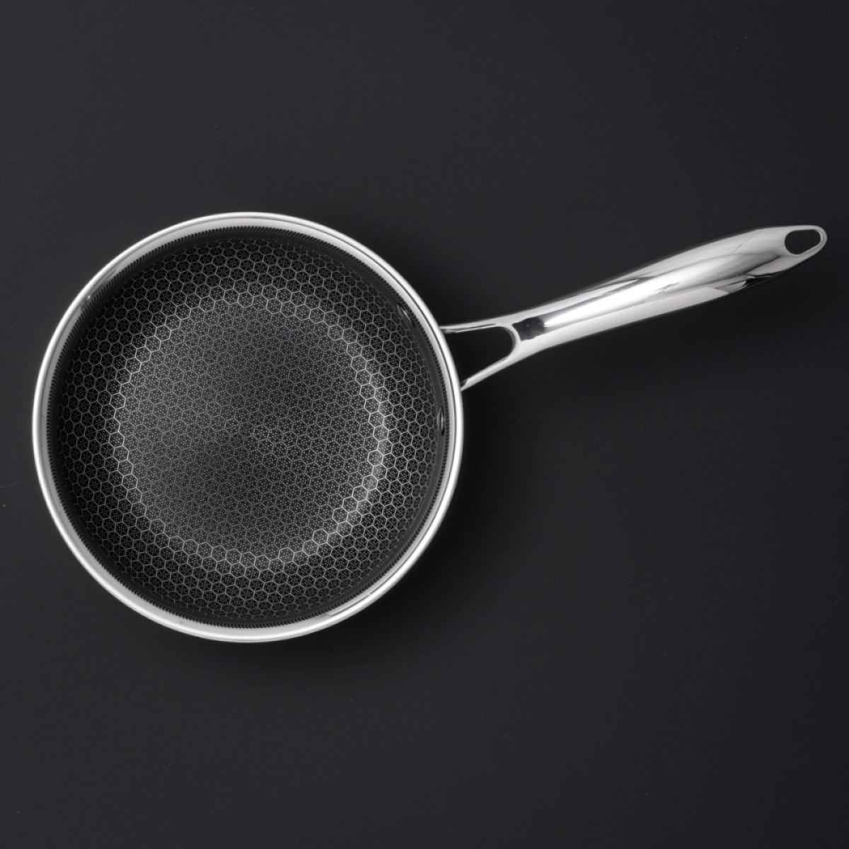 Opatentowana hybrydowa konstrukcja ze stali nierdzewnej i nieprzywierającej powłoki wzmocnionej pyłem diamentowym łączy w sobie wytrzymałość stali, łatwość czyszczenia nieprzywierającej patelni i zatrzymywanie ciepła przez żeliwo - idealne zarówno do codziennego gotowania, jak i bardziej ambitnych potraw. Trójwarstwowe dno zapewnia szybkie i równomierne rozprowadzanie ciepła, zapewniając bezpieczniejsze rezultaty i mniejsze ryzyko powstawania gorących punktów.