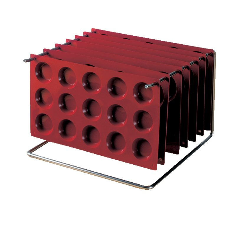 Każdy cukiernik na świecie długo czekał na ten produkt. Druciany stojak, który mieści 6-8 silikonowych foremek o standardowym rozmiarze (GN 1/3), gdzie mogą wisieć i schnąć po umyciu bez sklejania się i bez leżenia na płasko, przez co są mokre wiele godzin później. Ponadto zapewnia bardzo przejrzysty i przyjemny przegląd wszystkich różnych form, które w przeciwnym razie byłyby pomieszane. Wykonane ze stali nierdzewnej.