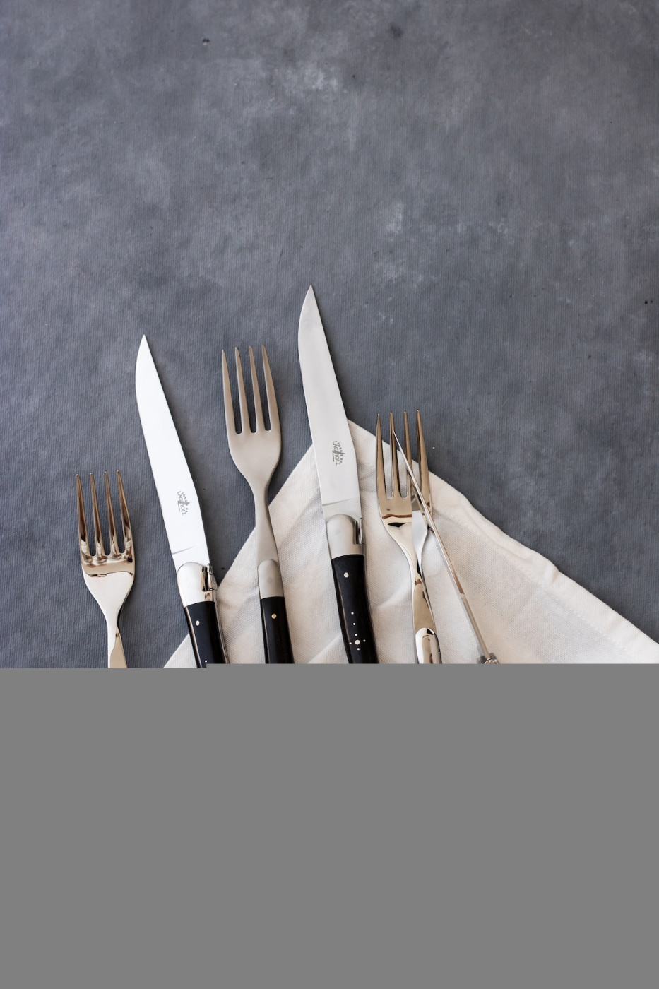 Tutaj ani milimetr nie jest pozostawiony jakości, ale każdy kawałek sztućców, który opuszcza małą fabrykę, jest dopracowany na poziomie szczegółów. Ostrza, wykonane z francuskiej stali nierdzewnej T14, są kute na miejscu w fabryce w piecach o temperaturze 1000 stopni. Drewniane lub zwierzęce rękojeści są wycinane i polerowane ręcznie przez doświadczonych knifemakerów, a dopasowanie ostrza jest niebiańskie. Wszystko jest idealne! To sztućce, które będą ukoronowaniem Twojego domu lub restauracji i przyjemnością użytkowania za każdym razem!