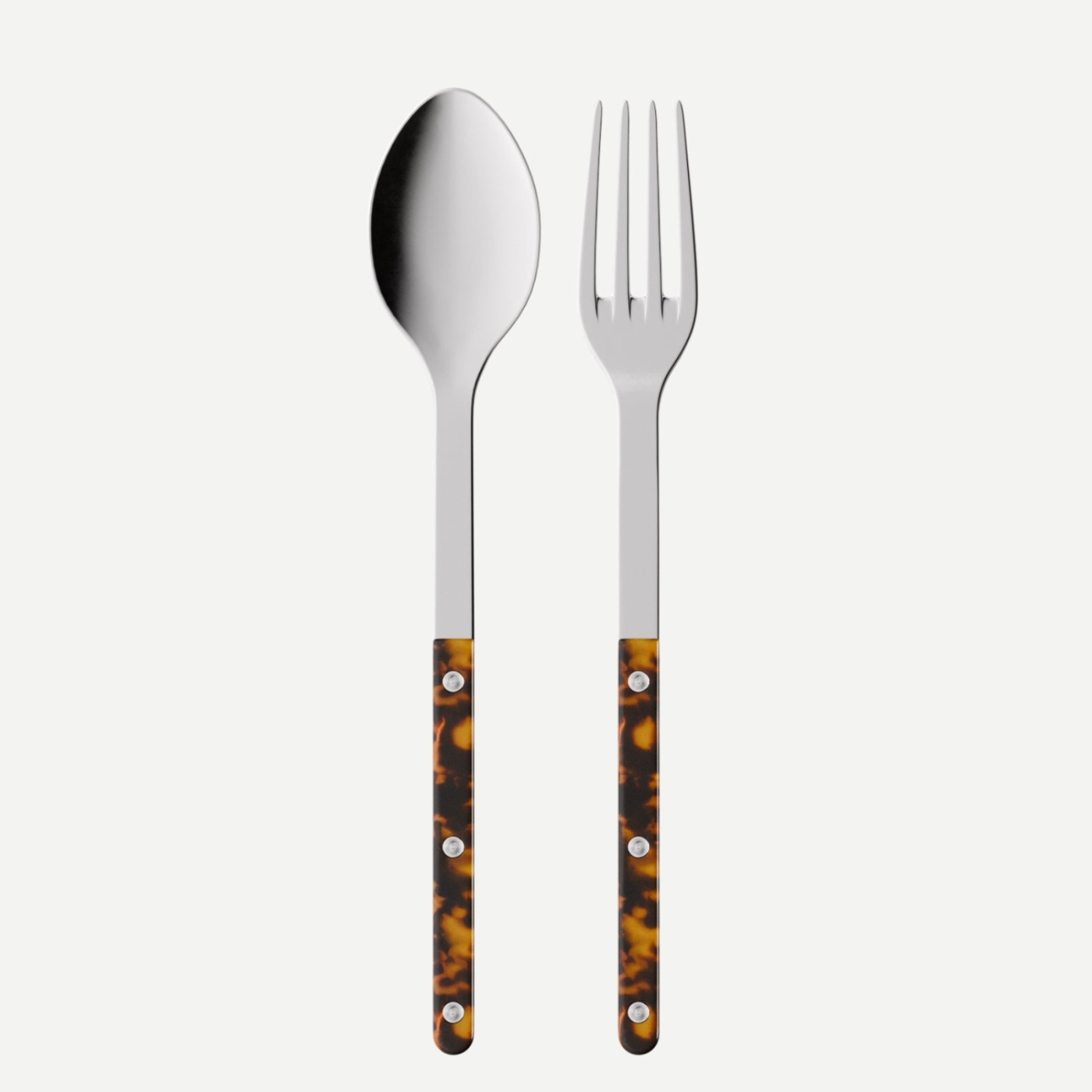 Wytrzymałe sztućce do serwowania z serii Bistrot, o dużej długości, ze stali nierdzewnej i trwałymi nylonowymi uchwytami. Wygodnie leżą w dłoni i zostały zaprojektowane tak, aby sprostać wymaganiom zarówno domowej, jak i profesjonalnej kuchni. Widelec zapewnia dobry chwyt bez ryzyka skaleczenia lub zmiażdżenia, a łyżka ma odpowiednią głębokość bez uczucia niezdarności. To połączenie sprawia, że są one stabilną parą do serwowania, która poradzi sobie z większością rzeczy na stole - rustykalnym, eleganckim lub pomiędzy. Tutaj w stylowym żółwim wzorze, który pasuje do okularów twojego intelektualnego dziadka.