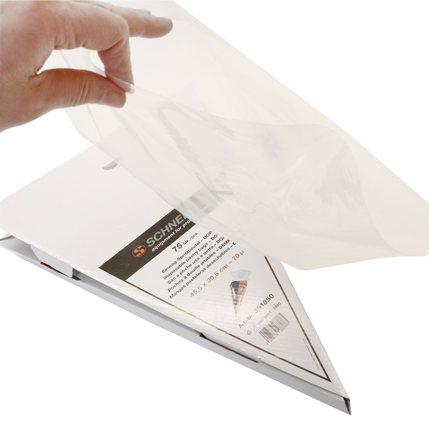 Jednorazowy worek do szprycowania z polietylenu, 70 µm, z wbudowaną przegrodą dzielącą worek na dwie oddzielne komory. Dwie masy pozostają oddzielone aż do końcówki i wyciskane są obok siebie jednym ruchem, tworząc dwukolorowe lub dwusmakowe dekoracje bułek, rozet i ślimaków bez przestawiania lub osobnego etapu produkcji.