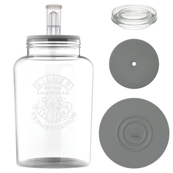 Pojemne naczynie fermentacyjne z syfonem. Słoik mieści pełne 5 litrów, dzięki czemu w jednej partii można przygotować kapustę kiszoną na tydzień. Pułapka wodna umożliwia ulatnianie się gazu, ale nie pozwala na przedostawanie się powietrza (zasadę tę można przetestować samodzielnie w wannie). Dołączone silikonowe i szklane obciążniki zapewniają, że wszystkie warzywa pozostają pod powierzchnią wody. W zestawie znajduje się również mała książeczka z przepisami w języku angielskim.