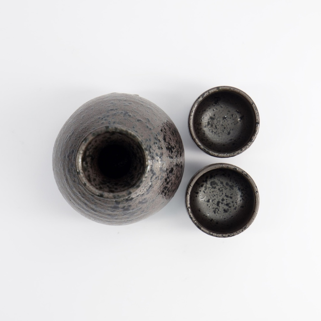Kompletny zestaw do sake składający się z tokkuri (karafki) i dwóch choko (kubków). Zestaw wykonany jest z kamionki z ciemną, żywą glazurą, która naprzemiennie zmienia odcienie szarości, czerni i brązu - wyraz japońskiego wabi-sabi, gdzie każda odmiana jest postrzegana jako znak autentyczności rzemiosła.